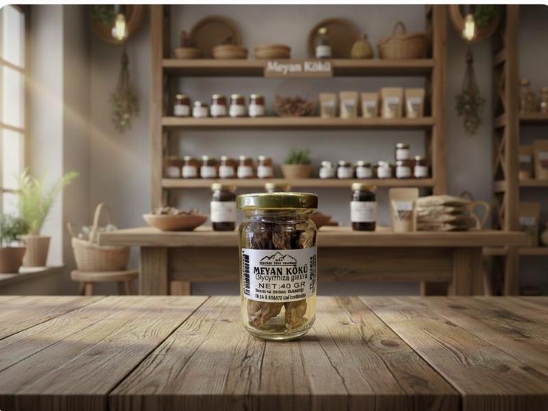 Özenle seçilmiş ve kurutulmuş meyan kökleri, cam kavanoz ambalaj içerisinde hijyenik şekilde sunulmaktadır.